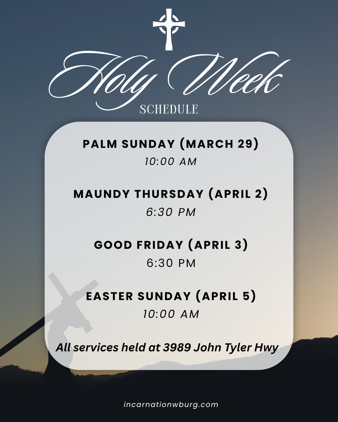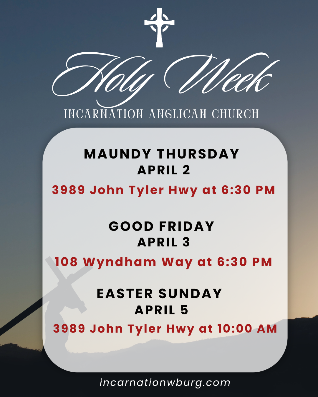 An Anglican community sharing the love of Christ Join us for worship! Sundays @ 10am3989 John Tyler Hwy Williamsburg, VA