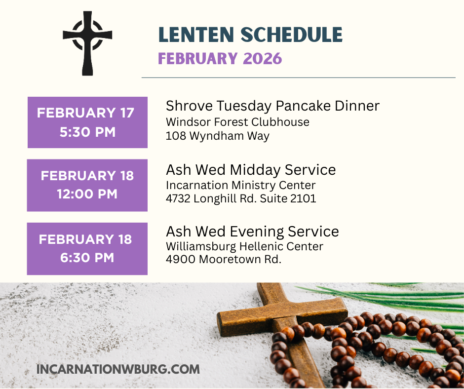 Join us at 6:30 PM at 4900 Mooretown Rd to worship and enter into the season of Lent together. An abbreviated service and the imposition of ashes will also be offered at noon at 4732 Longhill Rd Suite 2101.